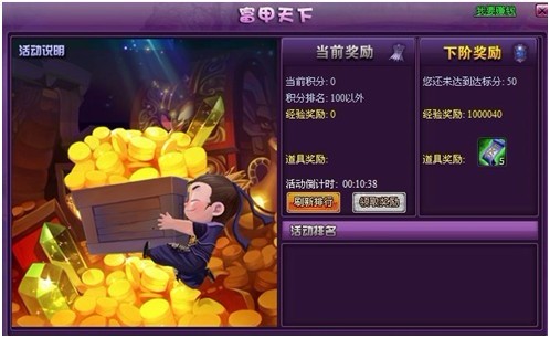 这是考较玩家赚钱能力的活动,按从系统获得金钱多少来对应积分,达到达标积分之上的排位即可领取奖励。