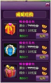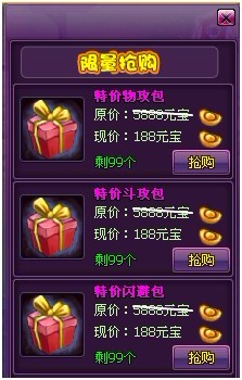 活动期间仅三天,伙伴、锻造、异火界面增加超值限量礼包【特价物攻包,特价斗攻包,特价闪避包,特价体悟包,特价洗灵包,超级技能包,特价强化包,特价打孔包,特价镶嵌包】,活动期间每天限量出售,不要错过机会喔!
