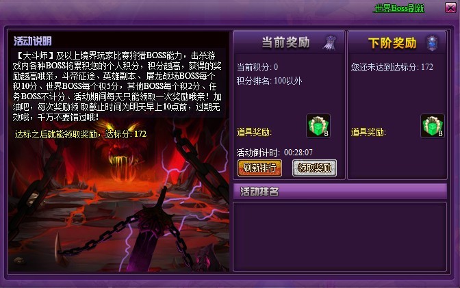 玩家通过击杀游戏内BOSS进行累计积分获得奖励,击杀的BOSS越多获得的积分越多,大斗师及以上境界玩家,击杀游戏内各种BOSS将累积您的个人积分,积分越高,获得的奖励越高。斗帝征途、英雄副本、屠龙战场BOSS每个积10分、世界BOSS每个积5分,其他BOSS每个积2分(任务BOSS将不会计算积分)。