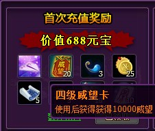 13、首次充值礼包内容取消原来的强化石奖励,增加四级威望卡20张,总计威望20w(对于之前有充值的玩家,系统会在更新之后直接赠送一次“首次充值奖励”,玩家依次打开【活动】-【礼包】-【首充礼包】-【领取】即可获得首充奖励)。