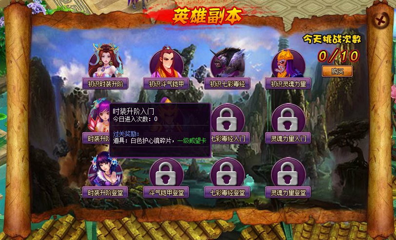 11、新增3个英雄副本:初识时装升阶、时装升阶入门、时装升阶登堂,通关副本可获得威望卡和各部位的时装升阶材料。