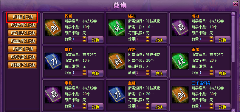 7、取消原蛇人神殿副本的神技书掉落,可使用神技残卷在‘兑换商城’兑换各职业神技书。取消原斗破良缘副本伙伴天赋技能书掉落,并调整为在斗帝征途副本掉落。
