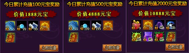 14、增加每日累计充值奖励:累积充值100元宝增加1w威望卡;累计充值500元宝增加5w威望卡;累计充值2000元宝增加10w威望卡。