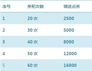 【活动内容】:1、祭祀到一定次数(含免费次数)即可获得点券奖励,详细见下表