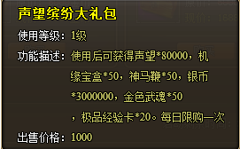 声望缤纷大礼包:使用后可获得声望*80000,机缘宝盒*50,炼灵丹*50,银币*3000000,金色武魂*50,极品经验卡*20。