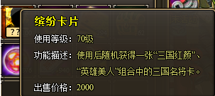 特殊说明:使用缤纷卡片后可随机获得一张“三国红颜”、“英雄美人”组合中的三国名将卡。