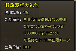 将魂豪华大礼包:使用后可获得将魂*50000,机缘宝盒*50,炼灵丹*50,银币*3000000,金色武魂*50,极品经验卡*20。