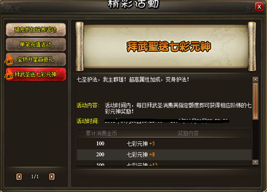 活动内容:活动时间内,每日拜武圣消费指定额度即可获得相应阶梯的七彩元神奖励!